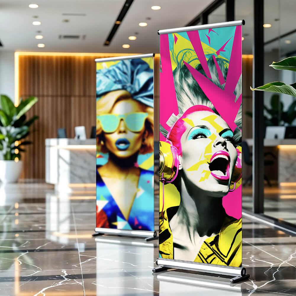 • Support : bâche ou film polyester avec dos gris (anti-transparence)
